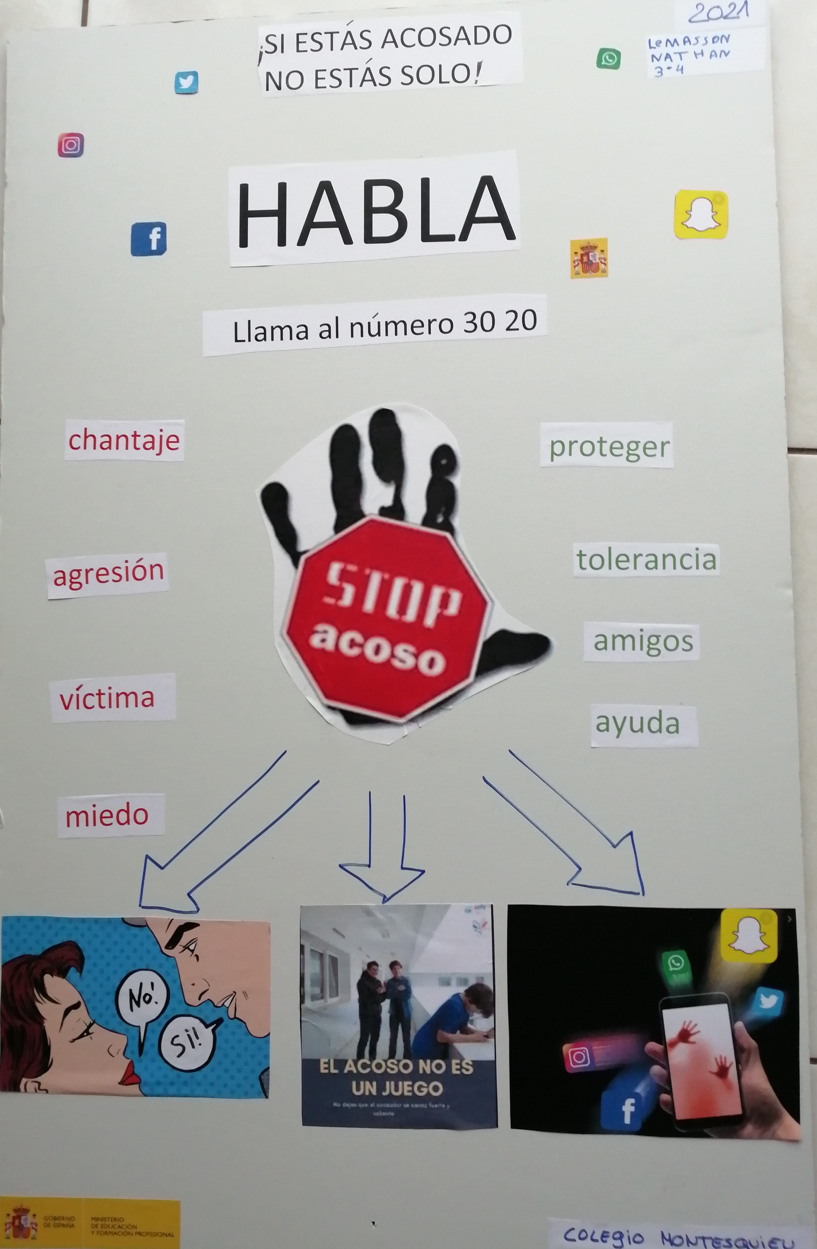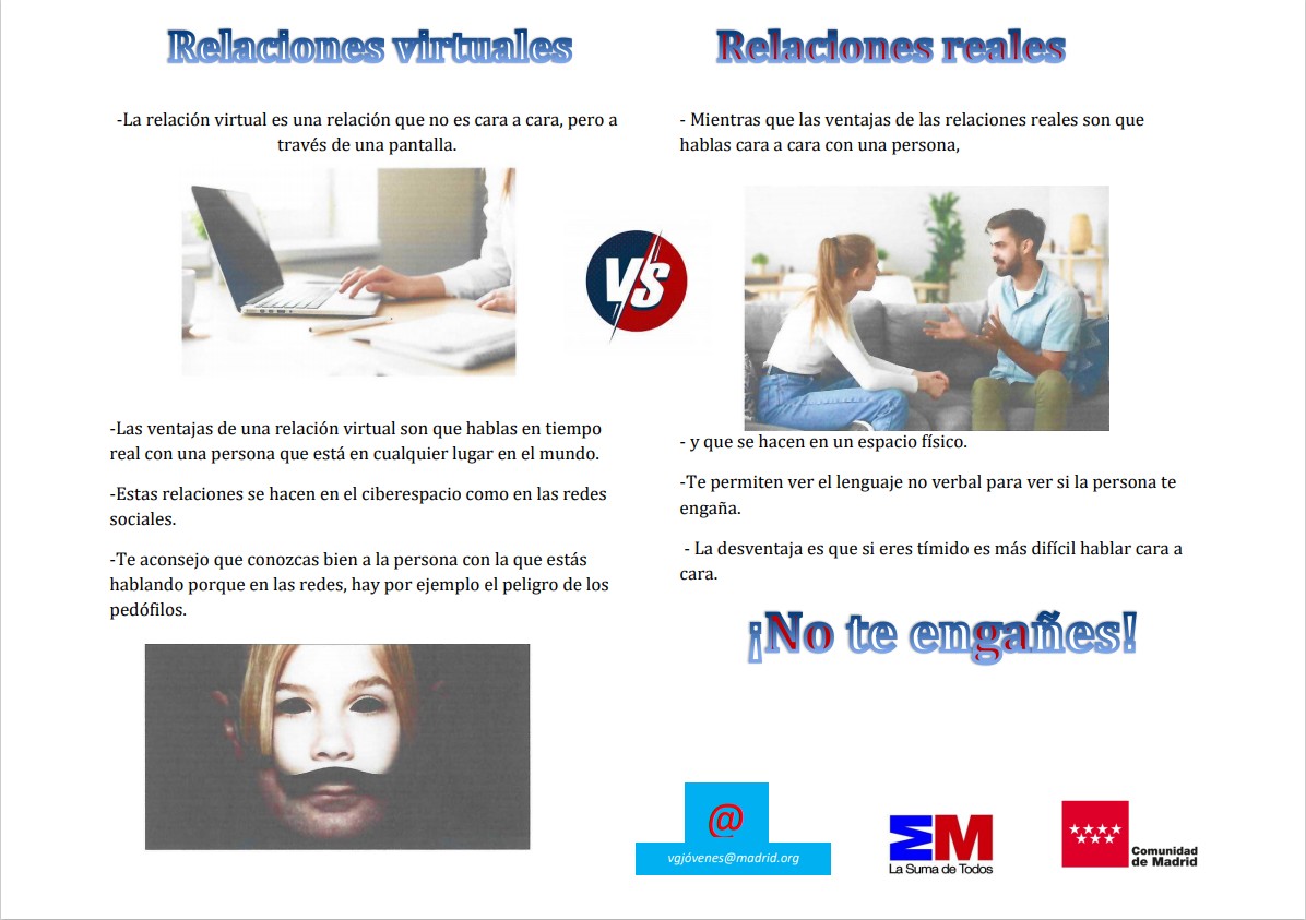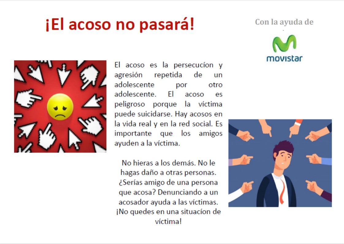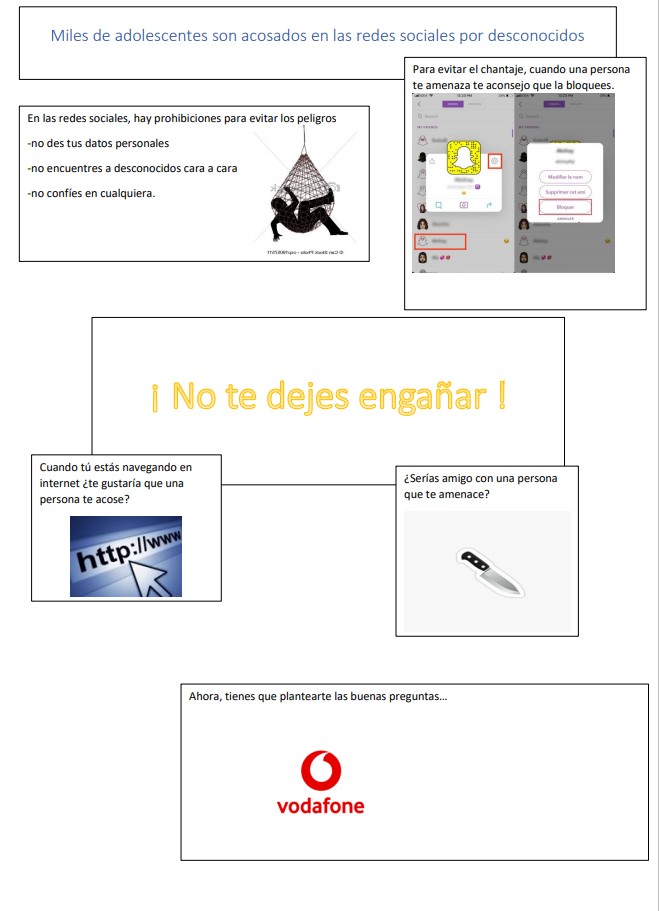 Dans le cadre d'une séquence de travail en espagnol avec Mme Zargouni, les élèves de 3ème 4 ont travaillé sur les relations humaines. En passant par l'amitié, les relations virtuelles, réelles, le harcèlement, ils ont découvert différentes campagnes de prévention, bandes annonces de film, et autres affiches pour les sensibiliser aux dangers de certaines relations et à ce qui fait qu'un relation peut être durable et saine.